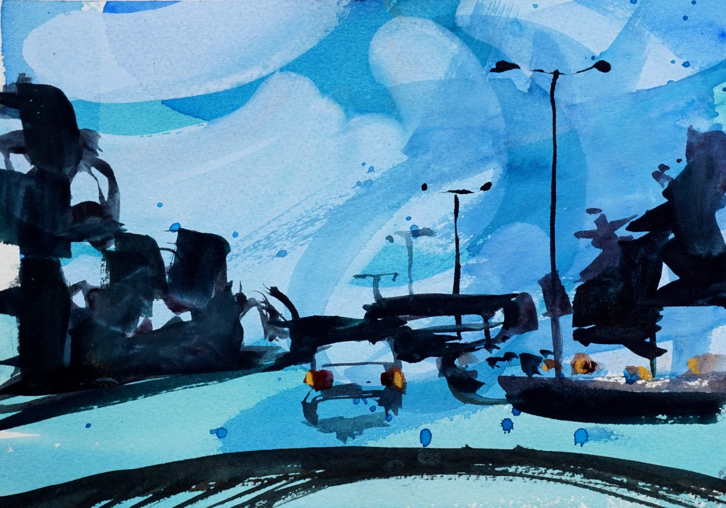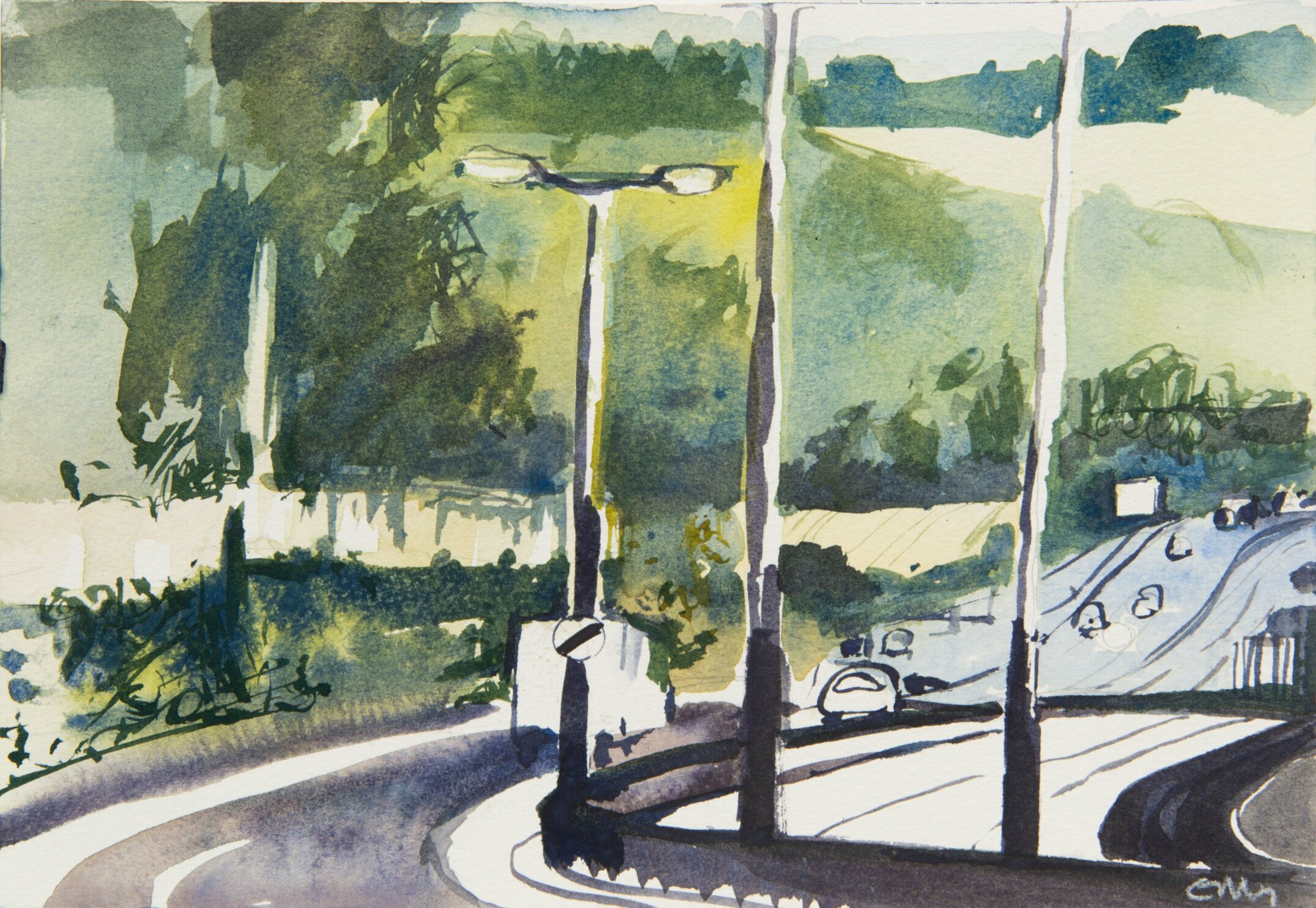 This series of small watercolours explores the beauty and space within the normality of road travel